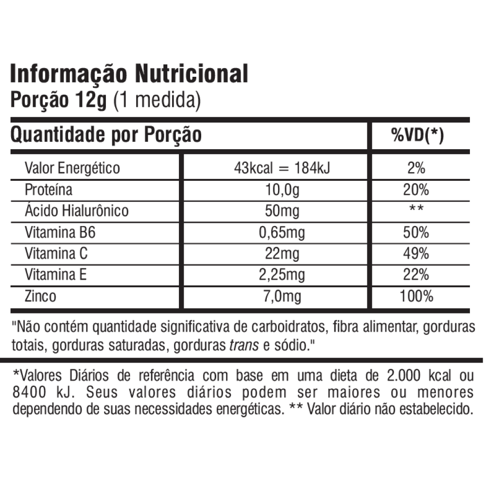 30 gramas é um suplemento alimentar desenvolvido para quem busca cuidar da beleza de dentro para fora. Formulado com peptídeos de colágeno hidrolisado de alta absorção e enriquecido com ácido hialurônico, contribui para a saúde da pele, unhas, cabelos e articulações.